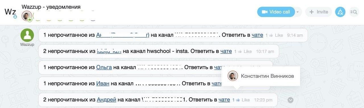 С каналами одновременно работают 2 администратора. Обращения клиентов, которые написали впервые, они передают отделу продаж, на остальные — отвечают сами. Так как все сообщения от пользователей поступают на один номер, а администраторов несколько, они отмечают свои запросы: в чате уведомлений ставят лайк рядом с обращением, которое приняли в работу. Это помогает не пропустить запрос клиента и не проверять карточку на наличие ответа. При наведении на лайк можно посмотреть, какой именно специалист работает с обращением.