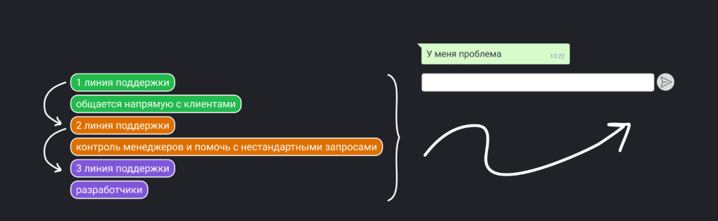 Первая линия в любой момент может передать обращение разработчикам и работать с клиентом в чате будут уже они. С нашей стороны один контакт может прыгать с линии на линию, ответить напрямую в чате может любой сотрудник, но клиент, со своей стороны, этого даже не заметит: его не переключают, внешне чат никак не изменяется, номер телефона остается прежним.