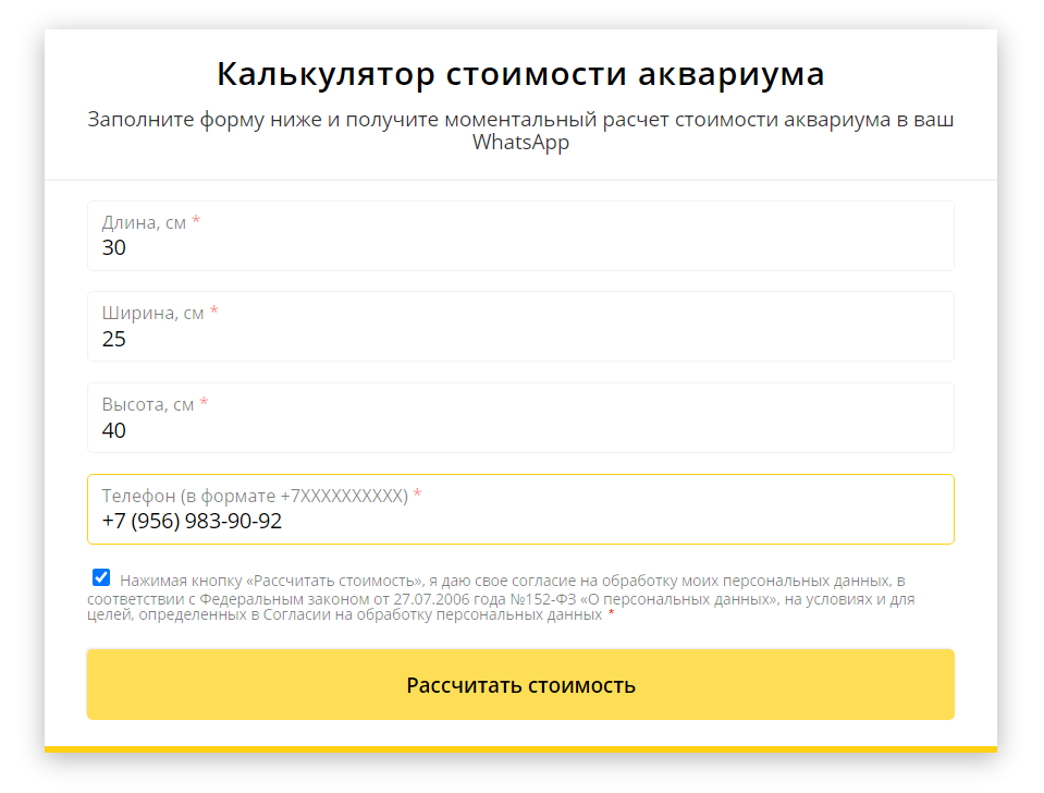 На сайте AQUADI появился онлайн-калькулятор. Теперь, чтобы оставить заявку, нужно заполнить форму по 3 параметрам и оставить номер телефона.