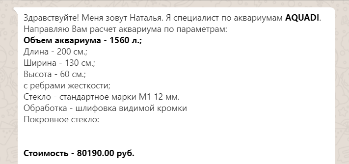 Несмотря на то, что AQUADI отправляет первое сообщение автоматически, аккаунт компании в WhatsApp не банят. Дело в том, что в сообщениях для разных пользователей много переменных: длина, ширина, высота, стоимость, ссылки. Хэш-сумма сообщений разная, поэтому WhatsApp не определяет их как автоматические.