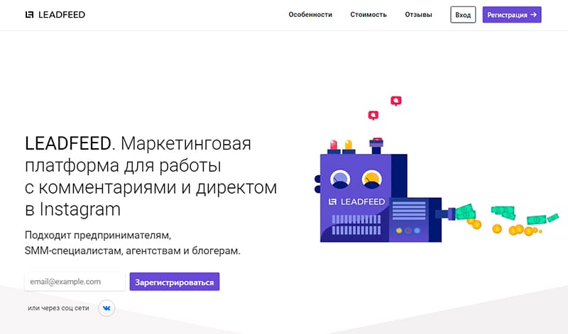 Этот сервис подходит для работы с комментариями и личными сообщениями в Инстаграм*. У платформы Leadfeed простая навигация, с которой вы сможете создать рассылки сообщений пользователям, которые уже писали вам в Директ. Инстаграм* не будет воспринимать ваши рекламные послания как рассылку спама, поэтому у вас появится эффективный способ продвижения аккаунта.