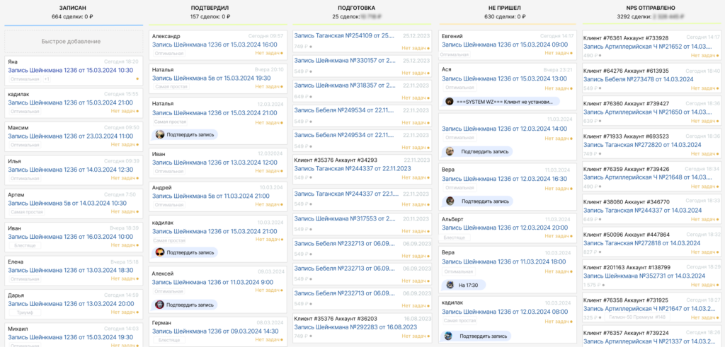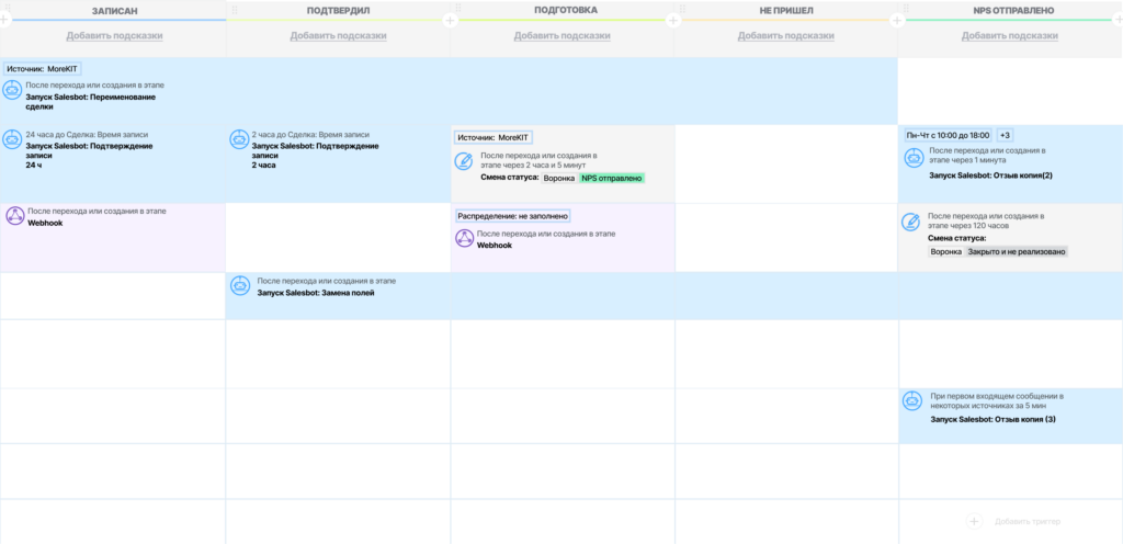 В большинство стадий воронки встроены боты для отправки сообщений, обработки ответов, автоматического тегирования сделок и оповещения сотрудников в случае возникновения ситуаций, в которые необходимо вмешаться.
