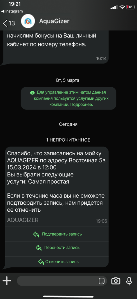 Когда клиент записывается на мойку, в WhatsApp приходит подтверждение — за сутки и за час до записи. Если планы изменились, человек может отменить или перенести бронь.