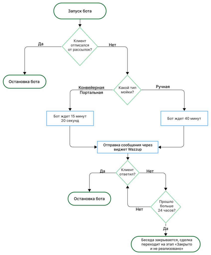 Чтобы исключить возможные зависания бота, его разделили на две части. Первая часть — это отправка сообщения. Сначала бот проверяет, что клиент не отписан от рассылки. Потом в зависимости от типа мойки ждет определенное количество минут, чтобы машину клиента точно успели помыть, и отправляет сообщение.