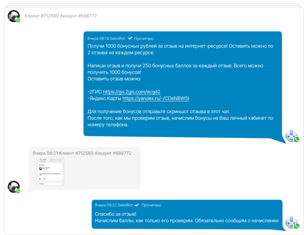 Если клиент ставит высокую оценку. Бот просит оставить отзыв на одном из сайтов, а взамен предлагает человеку бонусы и скидки от Aquagizer. Менеджер заранее вручную выбирает сайт, где у компании самый низкий рейтинг. Именно на этой площадке клиента просят поставить оценку.