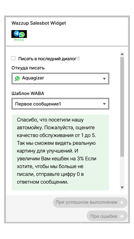 Сообщение отправляется в WhatsApp через виджет Wazzup. Клиента просят оценить качество обслуживания и предлагают за это кешбэк.