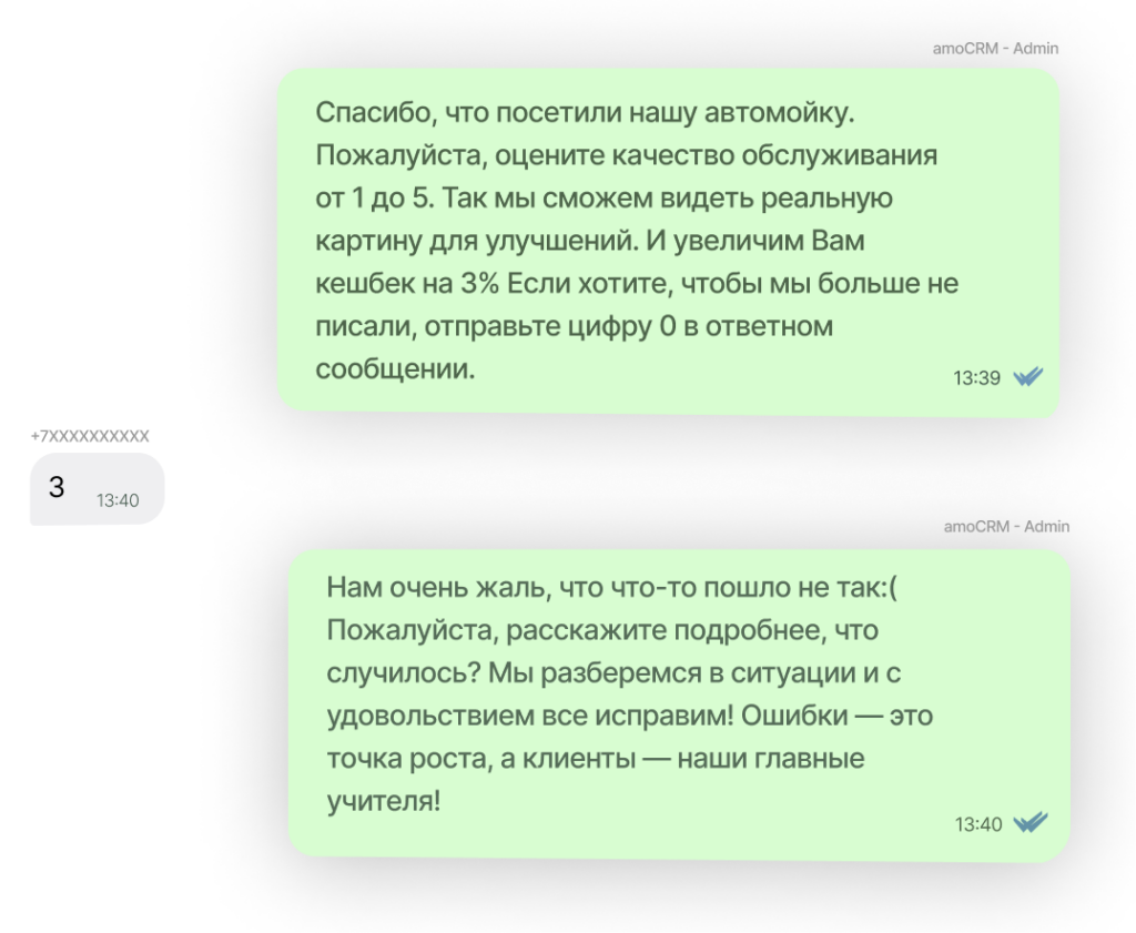 Чтобы оценить качество обслуживания на автомойке, клиенту достаточно отправить одну цифру в чат WhatsApp. Чем легче оставить оценку, тем выше вероятность, что пользователь это сделает.