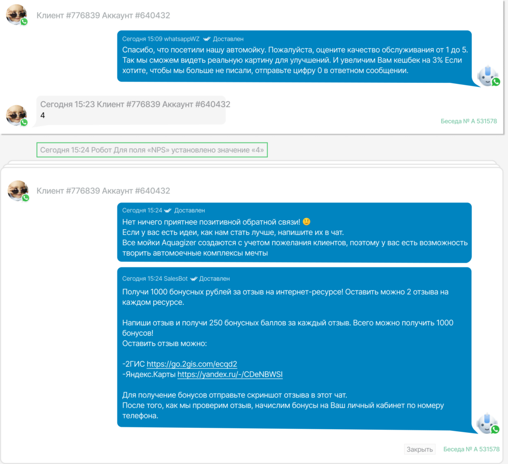 Когда клиент оплачивает услугу на автомойке, из учетной системы сделка передается в amoCRM и активируется бот. Через виджет Wazzup по каналу WhatsApp Business API бот отправляет клиенту NPS с просьбой оценить качество обслуживания.