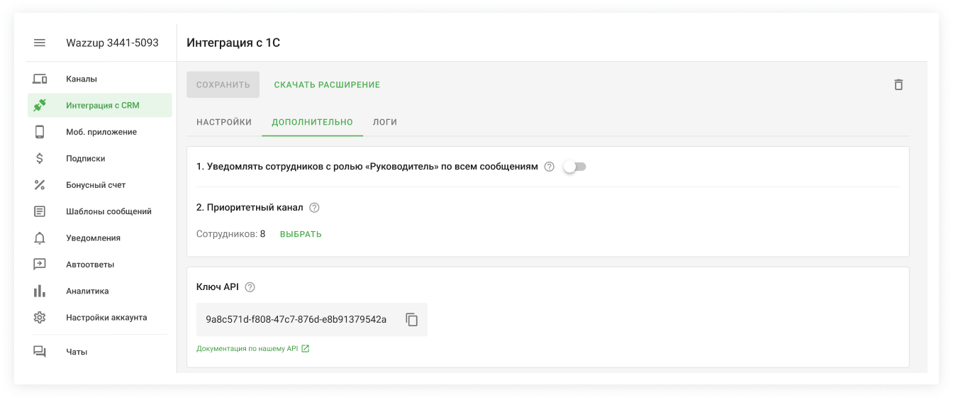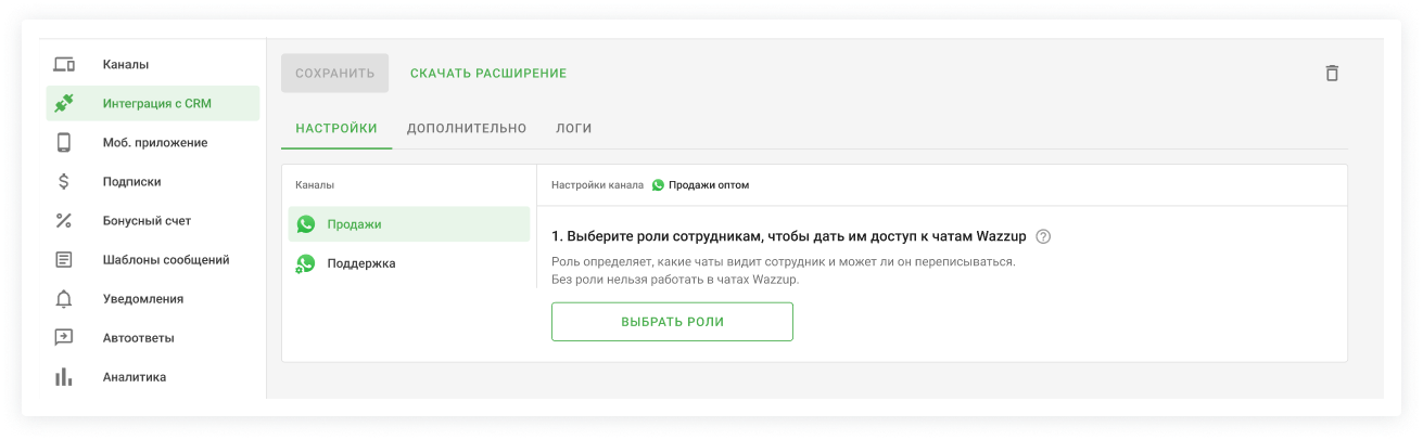 Настройки отображаются во вкладке «Интеграция с CRM» после подключения интеграции. Если у вас подключено несколько каналов, интеграцию для каждого канала нужно настроить отдельно.