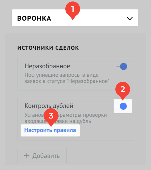 3. Включите ползунок напротив «Контроль дублей» → нажмите «Настроить правила».