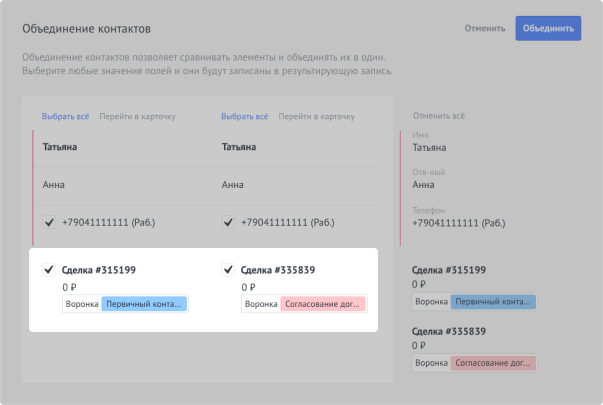 3. Отметьте, какие данные о контакте нужно оставить. Оставьте галочки на всех сделках → нажмите «Объединить».