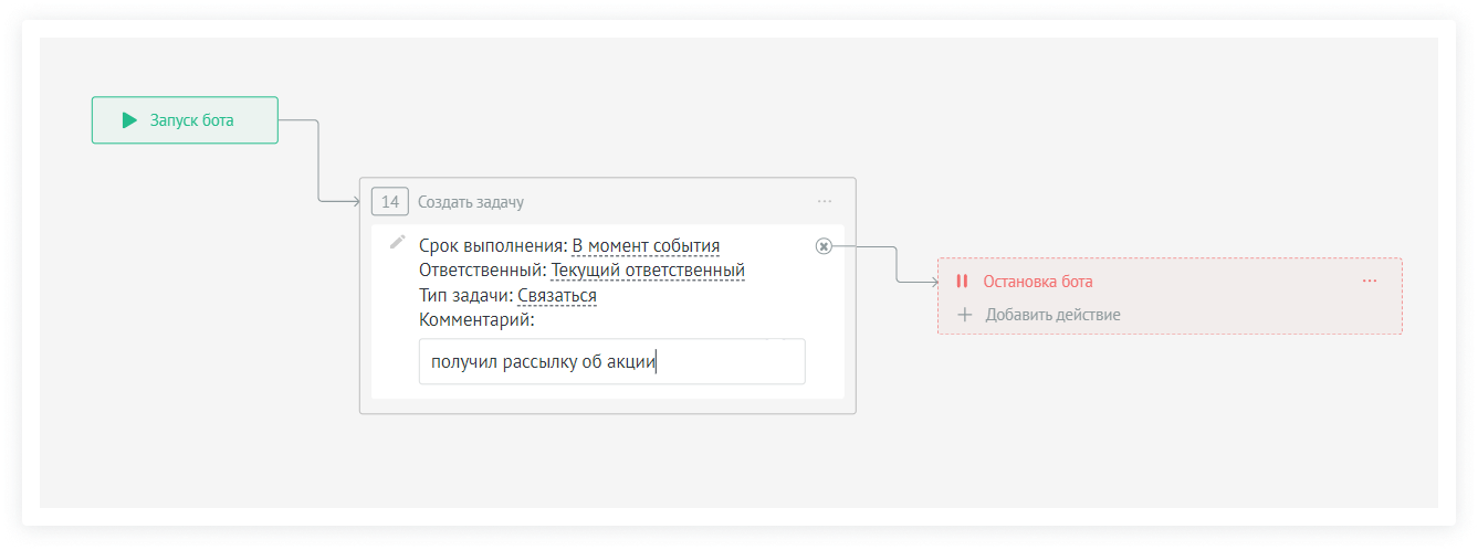 Укажите действие, которое боту нужно сделать. В нашем примере мы поставим продавцу задачу связаться с клиентом. После разговора он решит, как поступить со сделкой.