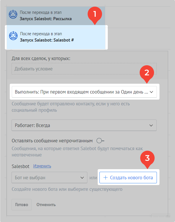 1. Нажмите на ячейку под ботом с рассылкой → выберите Salesbot.