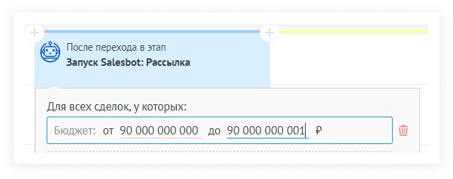 Если указать такое условие для срабатывания триггера, которому не будет соответствовать ни одна сделка — рассылке будет некому уходить. Подойдет условие со скриншота ниже. Если не продаете яхты и элитную недвижимость, конечно.