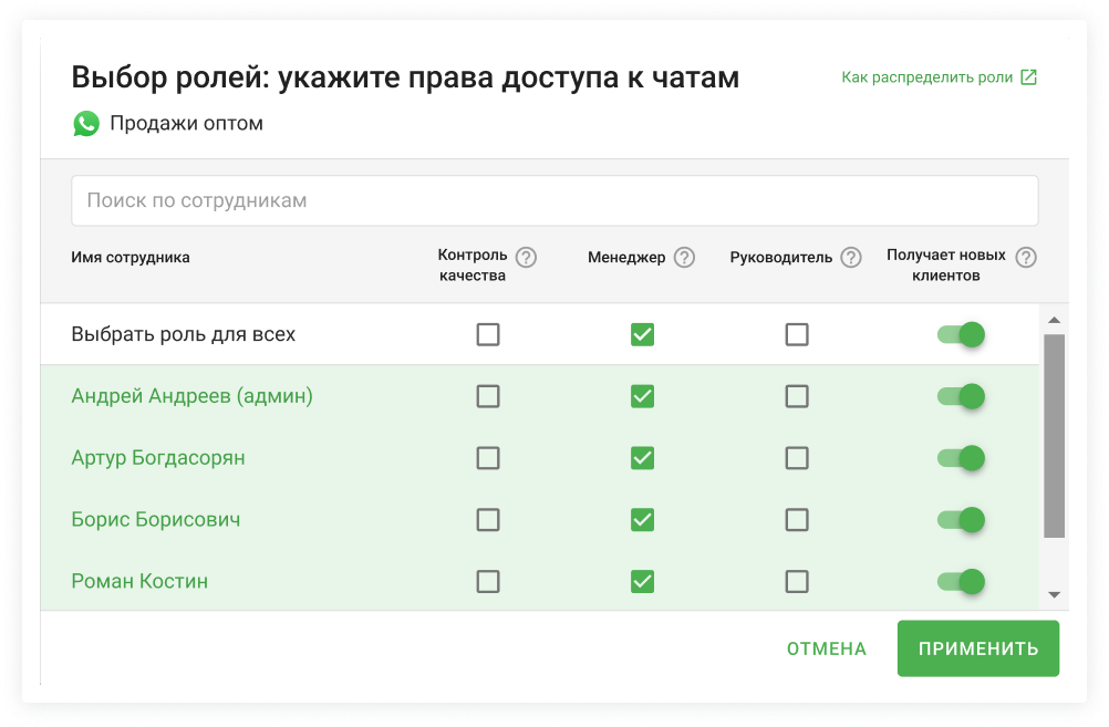 Роль определяет права сотрудника: какие чаты он видит и может ли он переписываться с клиентами. Чтобы назначить роли, нажмите «Выбрать роли» → откроется модальное окно со списком всех сотрудников из CRM.