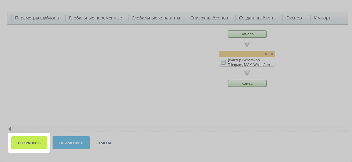 Заполните оба поля. Если сообщение будет уходить с канала WhatsApp, Max, Viber или Telegram, Бизнес-процесс поймет, что нужно отправить текст из поля «Сообщение». Если с канала WABA — то бот отправит выбранный шаблон. Сразу с двух каналов сообщения не уйдут — только с одного.