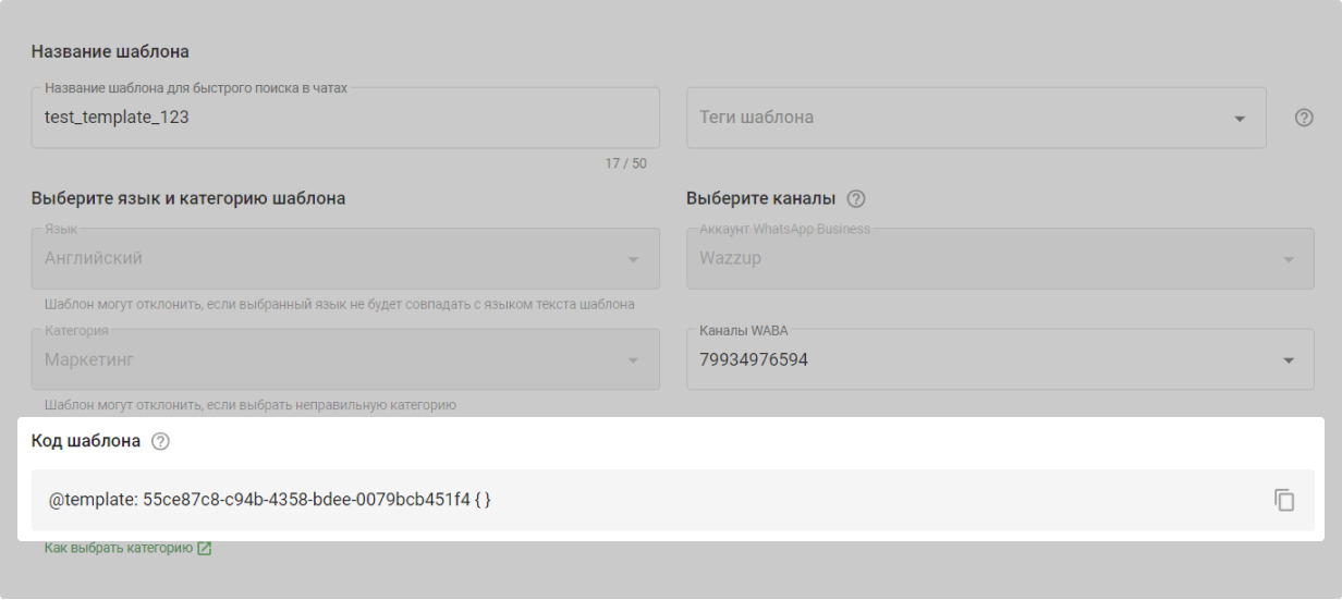 Чтобы добавить в Робота шаблон WABA, нужен его код. Код появится в личном кабинете, когда шаблон пройдет модерацию: