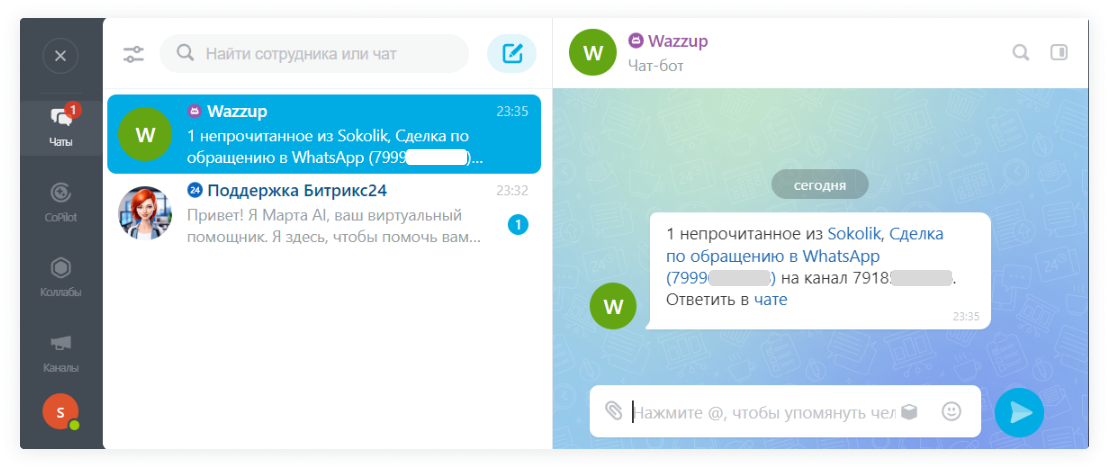 На правой панели Битрикс24 находится чат с ботом Wazzup — в него приходят уведомления о новых сообщениях. Чат создается автоматически при установке приложения Wazzup.