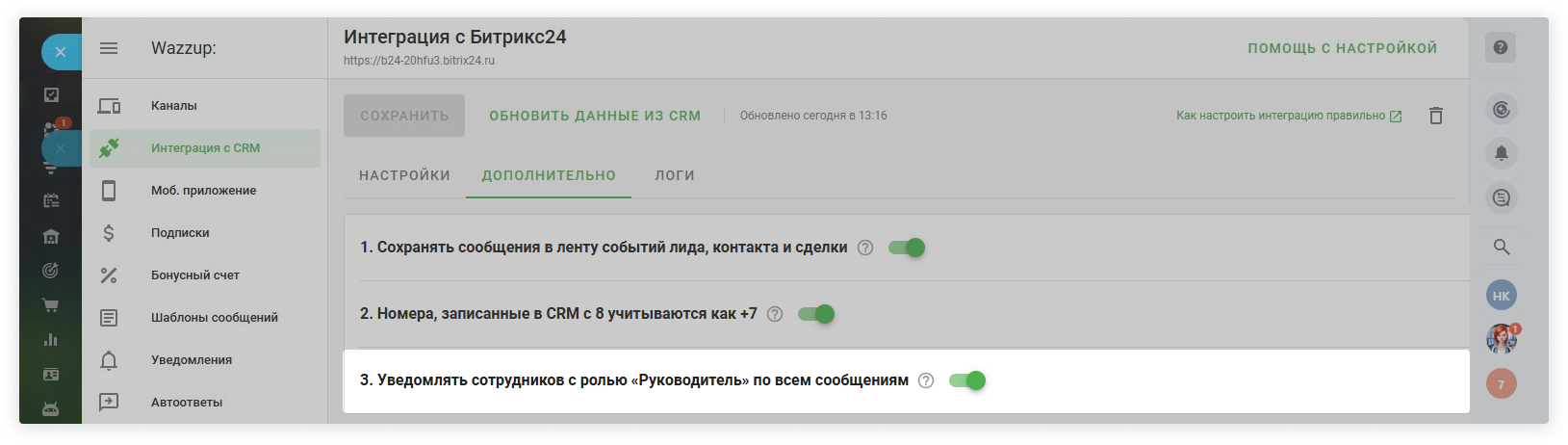 Если в п.3 дополнительных настроек интеграции включена опция «Уведомлять сотрудников с ролью «Руководитель» по всем сообщениям», уведомления также будут отправляться еще и всем сотрудникам с ролью «Руководитель».
