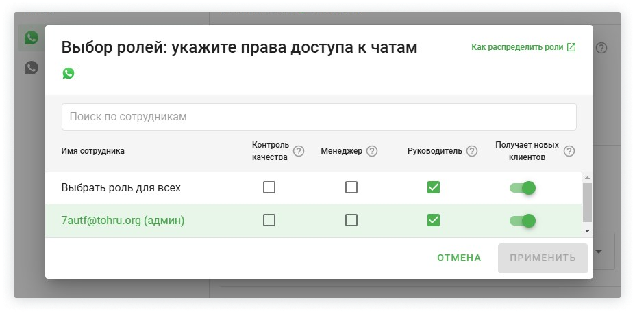 настроек интеграции «Выберите роли сотрудников» включен ползунок «Получает новых клиентов».
