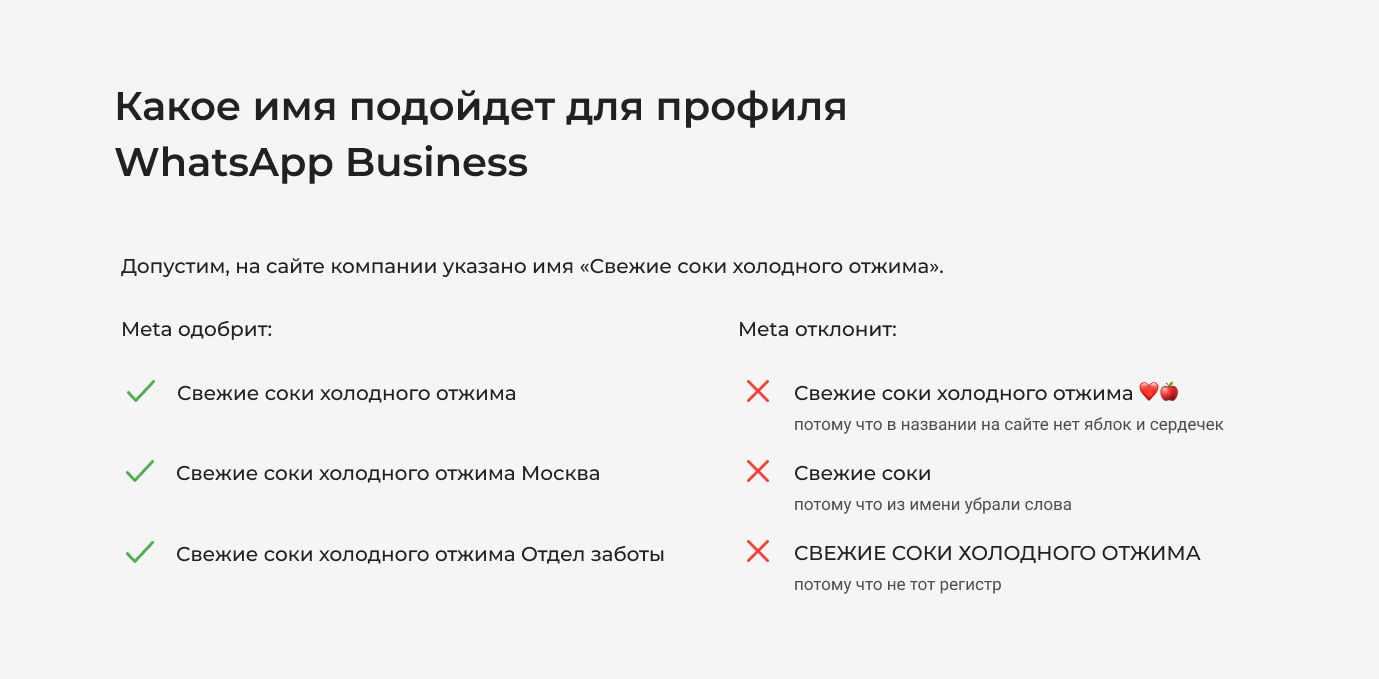 В некоторых случаях в имени профиля не получится указать название вашей компании, потому что Meta* не разрешает использовать: