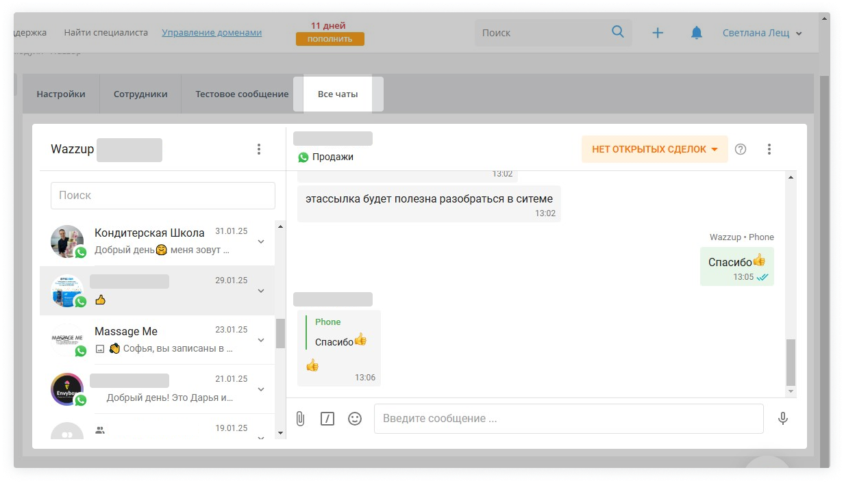 После подключения модуля Wazzup чаты с клиентами будут доступны в двух местах: