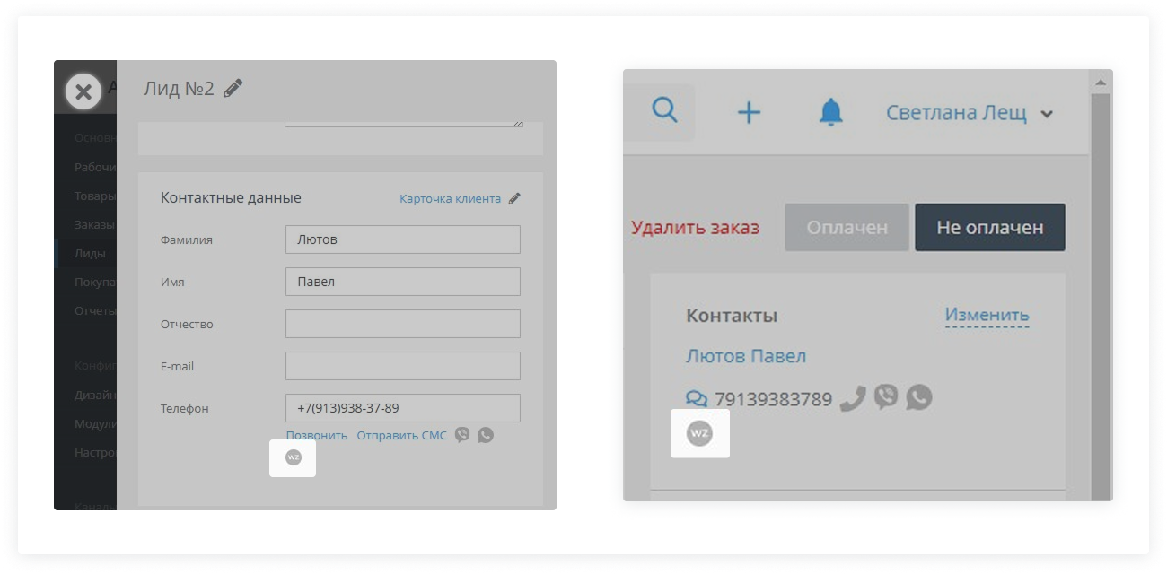 В карточке клиента → значок Wazzup Если клиент уже есть в вашей CRM, его переписка появится прямо в карточке. Нажмите на значок Wazzup, чтобы открыть диалог и продолжить общение.