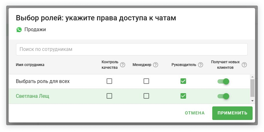 Включите ползунок «Получает новых клиентов» у сотрудников, которым нужно автоматически назначать входящие заявки.