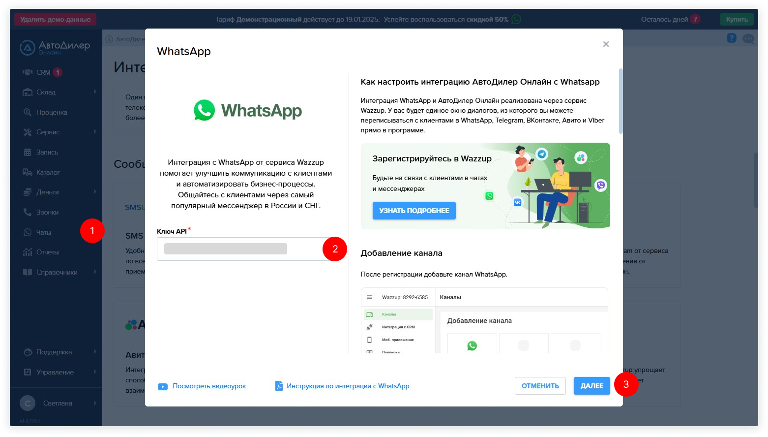 4. Перейдите в АвтоДилер Онлайн → откройте раздел «Чаты» → выберите WhatsApp → вставьте ключ API в форме окна интеграции в АвтоДилер Онлайн → нажмите кнопку «Далее».