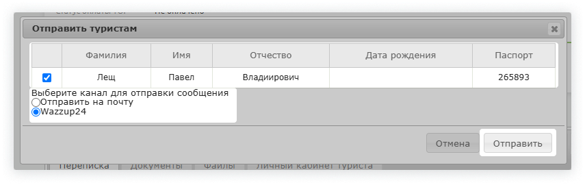 Выберите туриста, выберите канал отправки «Wazzup» и подтвердите отправку, нажав «Отправить».