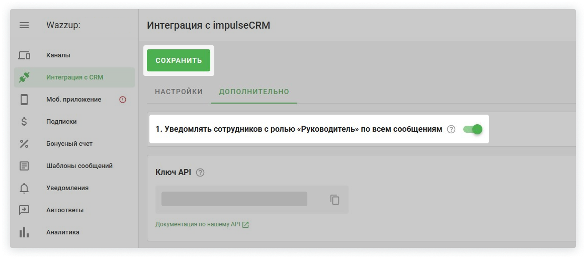 7. В настройках выберите канал связи Wazzup и укажите, какие уведомления хотите получать → нажмите «Сохранить».