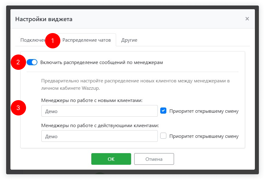 13. Нажмите «Настройки» → включите распределение чатов, укажите нужные настройки, нажимаем «ОК» и «Сохранить».
