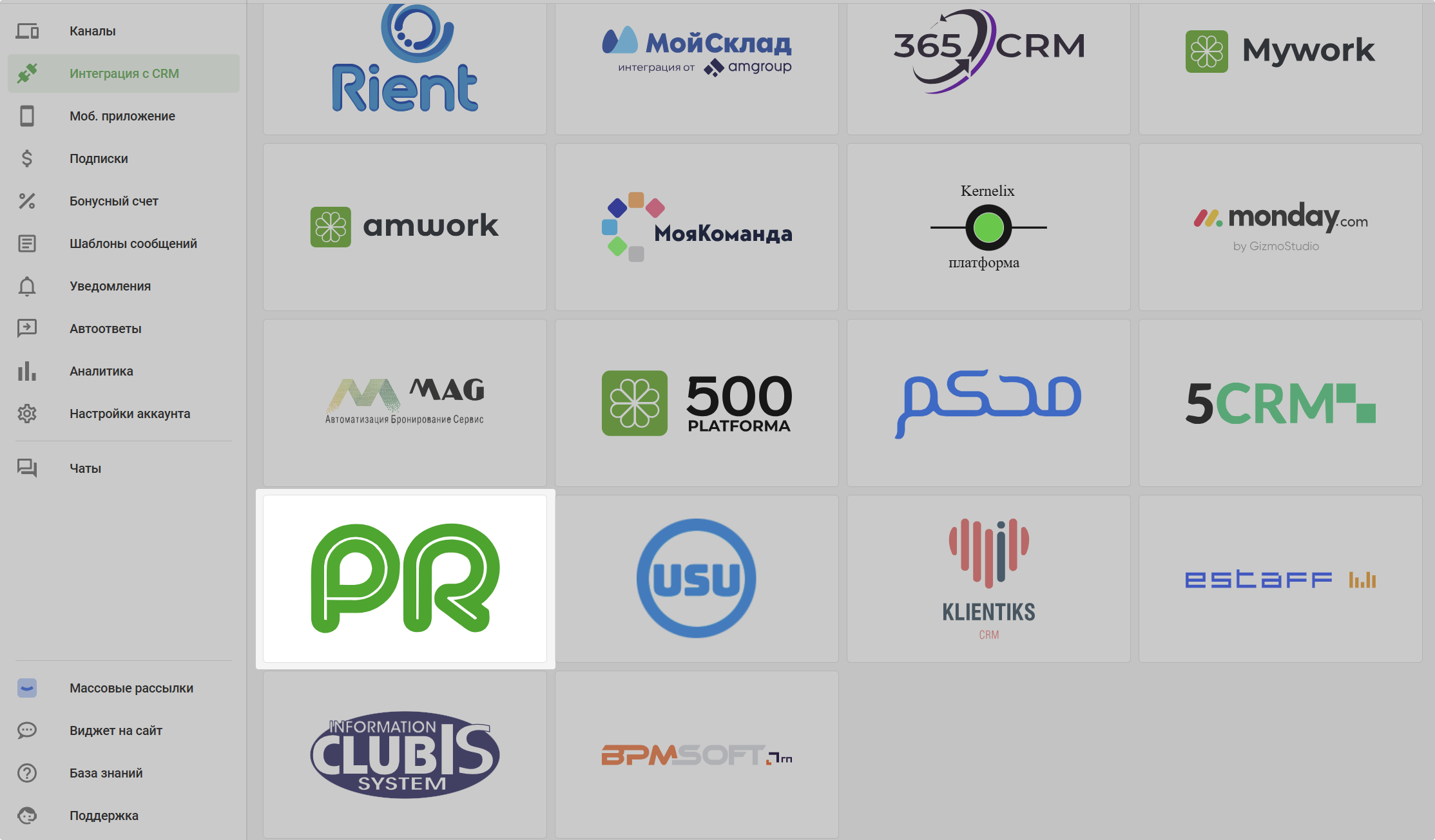 Вас перенаправит на страницу интеграции в PrivateCRM.