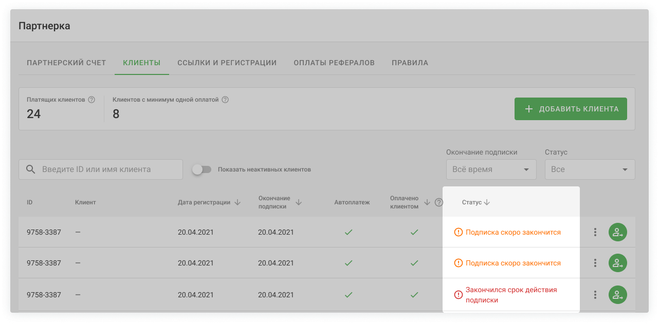 В таблице есть колонка Статус — в ней отображаются текущие проблемы с подпиской или каналами клиента. Вы можете отфильтровать клиентов по этим статусам, чтобы быстрее найти нужных.