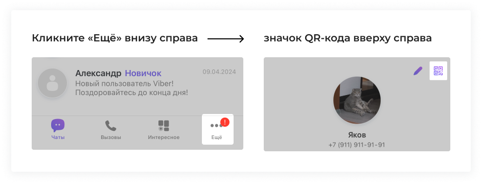 3. Отсканируйте QR-код: в приложении Viber на телефоне нажмите «Ещё» справа внизу → значок QR-кода в правом верхнем углу.