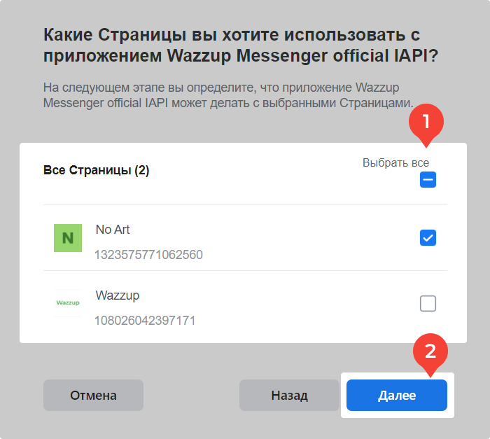 7. Оставьте включенными все ползунки. Если что-то отключить и не дать какие-то права приложению Wazzup Messenger Official API — канал будет работать некорректно.