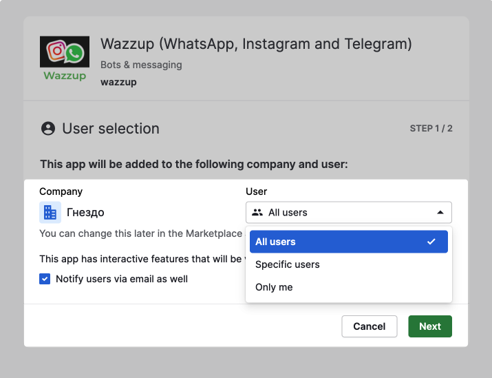 3. В открывшейся вкладке браузера выберите All users. Поставьте галочку «Notify users via email as well», если хотите, чтобы ваши сотрудники получили письма на почту о подключении.
