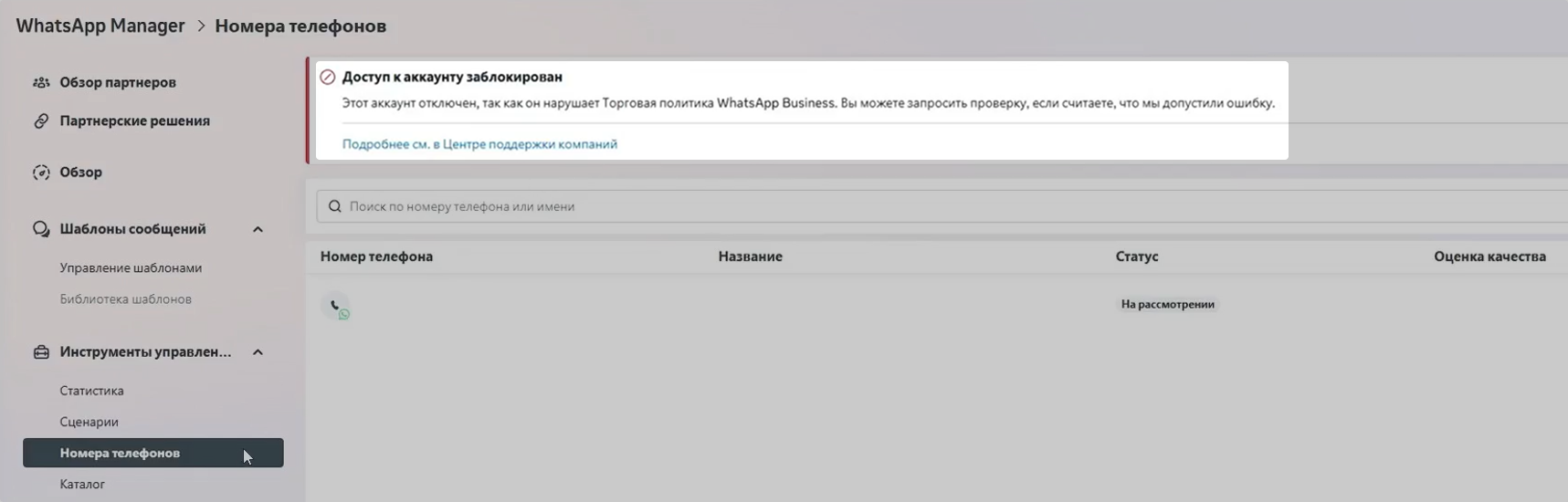 Перейдите в «Номера телефонов» в WhatsApp Manager → посмотрите статус номера. Если «Заблокирован» — это бан.