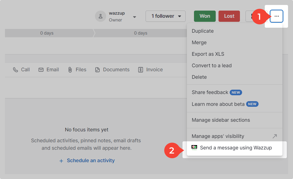 Вы можете переписываться с клиентами из «родных» чатов Pipedrive во вкладке «Обмен сообщениями» или в чатах Wazzup, которые встроены в CRM. Чат Wazzup с клиентом можно открыть из карточки контакта или сделки. Там отобразятся только диалоги с контактами, которые привязаны к карточке.