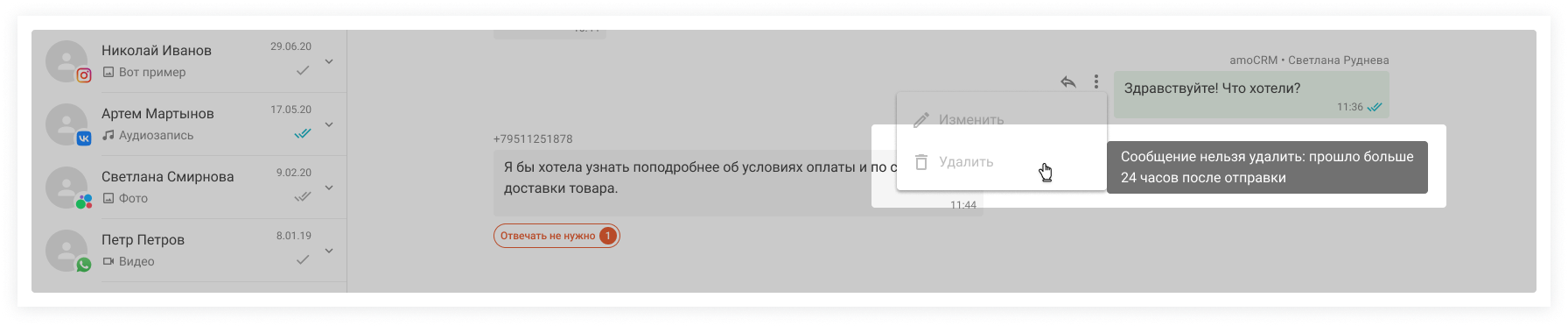 Удалить сообщение можно в течение 24 часов для WhatsApp, Max, Telegram и Telegram Bot. Для Avito — в течение 1 часа. После этого кнопка удаления становится неактивной.