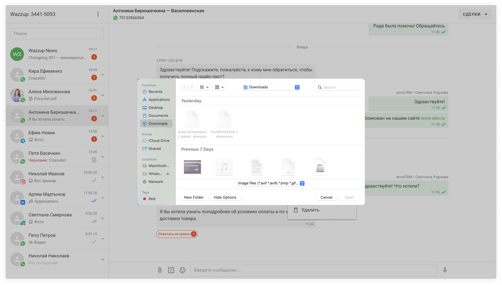 Как и в мессенджерах, в Wazzup доступно редактирование и удаление сообщений, поэтому продавец сможет быстро исправить опечатку или удалить случайно отправленное.