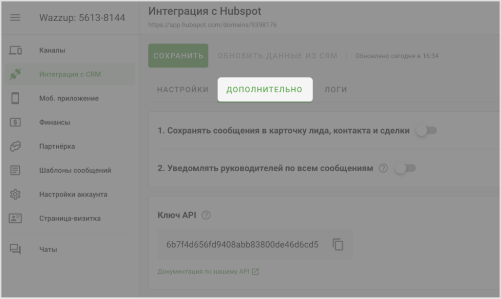 Настройки отображаются во вкладке «Интеграция с CRM» после подключения интеграции. Если у вас подключено несколько каналов, интеграцию для каждого канала нужно настроить отдельно.