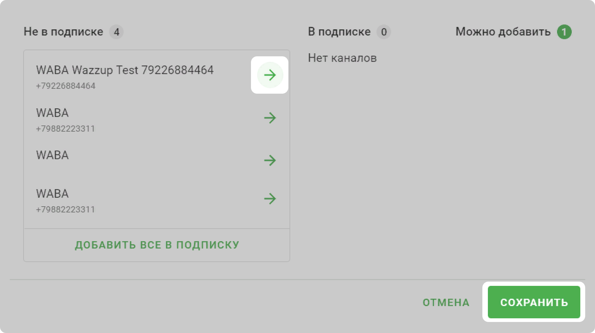 Каналы добавятся в подписку автоматически после оплаты. Например, если у вас в аккаунте 2 канала WhatsApp и вы добавляете подписку на 1 канал, то Wazzup случайным образом выберет канал и добавит его в подписку.