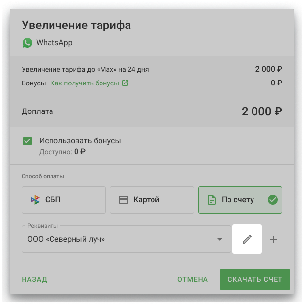 При безналичной оплате деньги могут идти до 3 рабочих дней. А подписка заработает, когда мы получим оплату на расчетный счет Wazzup. Поэтому, если надо оплатить сервис срочно, лучше выбирайте оплату картой или СБП.