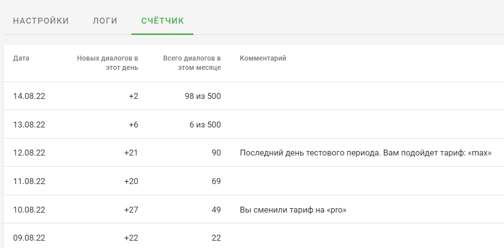 В столбце справа — количество новых диалогов в день, слева — сколько всего диалогов в этом месяце. Если вы начнёте приближаться к лимиту, в графе «Комментарий» появится рекомендация перейти на тариф выше.