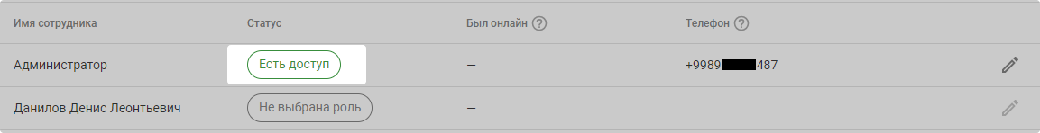 3. Чтобы дать доступ, нажмите на карандаш справа от имени сотрудника → введите телефон сотрудника (на него будут приходить СМС-коды для входа) → «Изменить». Статус сотрудника поменяется на «Есть доступ».