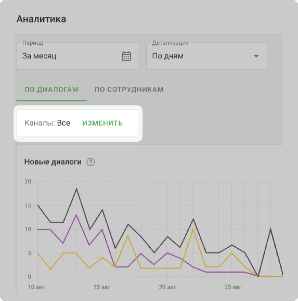 Посмотреть статистику по каналам можно только во вкладке «По диалогам». Для этого нажмите на кнопку «Изменить» на панели «Каналы» и укажите нужные.